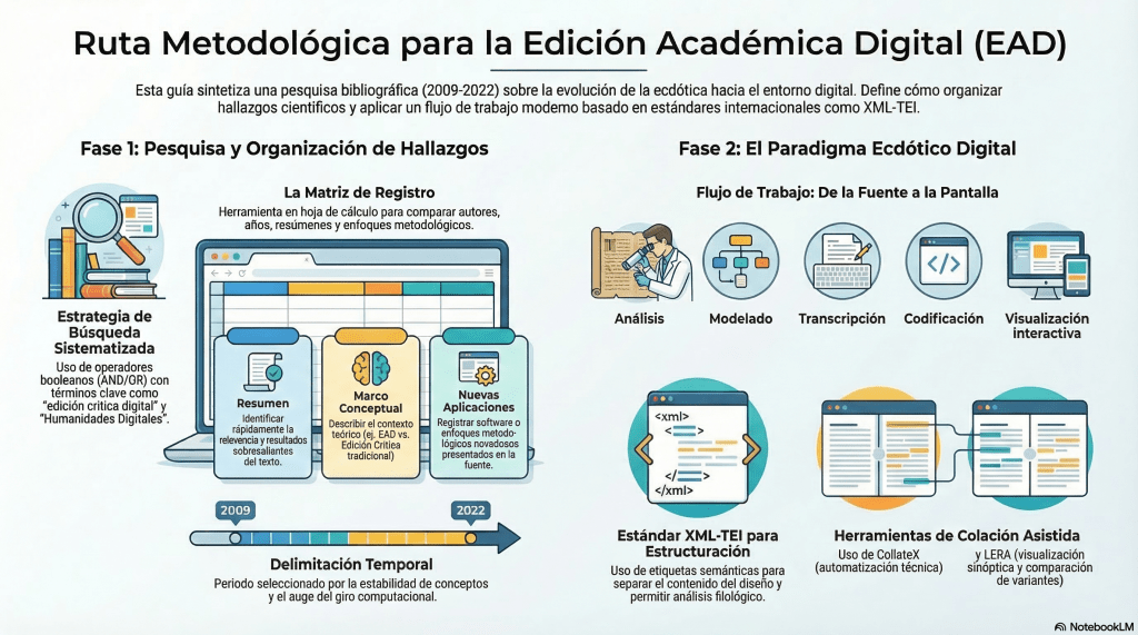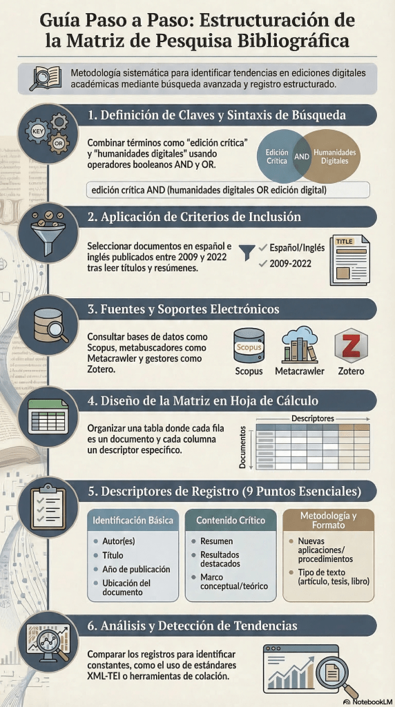 La pesquisa bibliográfica funcionó como una estrategia de investigación sistemática para revisar, analizar y valorar qué se ha hecho en filología digital en Colombia, en particular en ediciones críticas y genéticas. En lo técnico, la búsqueda se apoyó en operadores booleanos y un conjunto de palabras clave aplicadas en motores y bases especializadas como Scopus y Metacrawler, con un recorte temporal pensado para trabajar sobre un periodo de relativa estabilidad conceptual (2009–2022) y en dos idiomas, español e inglés.