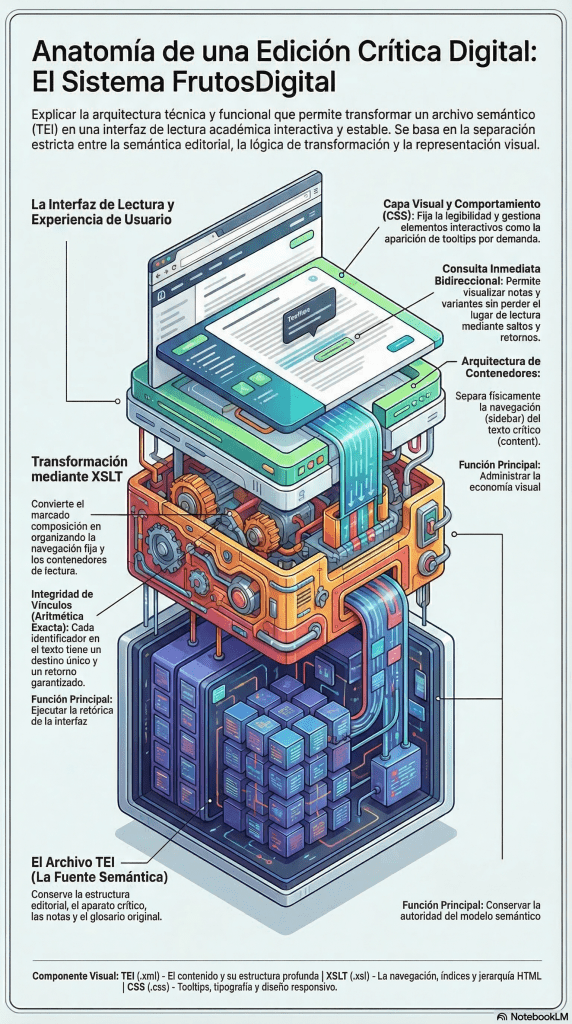 La publicación de una edición digital como FrutosDigital se define como el proceso de transformar la semántica editorial conservada en un archivo XML-TEI en una interfaz legible e interactiva a través de hojas de estilo XSLT y archivos CSS. Este flujo de trabajo se basa en una estricta división de funciones: mientras el TEI mantiene la lógica documental y la autoridad del modelo —incluyendo la estructura, el aparato crítico, las notas y el glosario—, la hoja XSLT ejecuta la transformación a HTML fijando la retórica de la interfaz, y el CSS administra la economía visual y la legibilidad. La arquitectura de la publicación organiza el contenido en contenedores explícitos que separan la navegación lateral (sidebar) del espacio de lectura (body), permitiendo una experiencia de lectura continua que se enriquece con un sistema de consulta inmediata. Mediante el uso de tooltips y enlaces bidireccionales, el lector puede visualizar notas, variantes y términos del glosario por demanda sin necesidad de desplazamientos obligatorios, manteniendo siempre un principio de retorno inmediato al texto. En suma, la publicación en este paradigma no es simplemente «tener una página web», sino sostener una fuente semántica verificable con una capa de representación reemplazable, donde la credibilidad del aparato crítico depende de la integridad técnica y la simetría de sus identificadores y vínculos.
