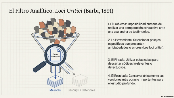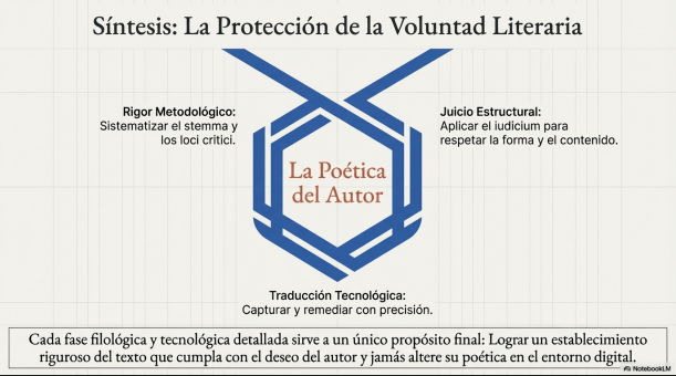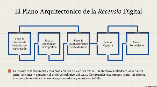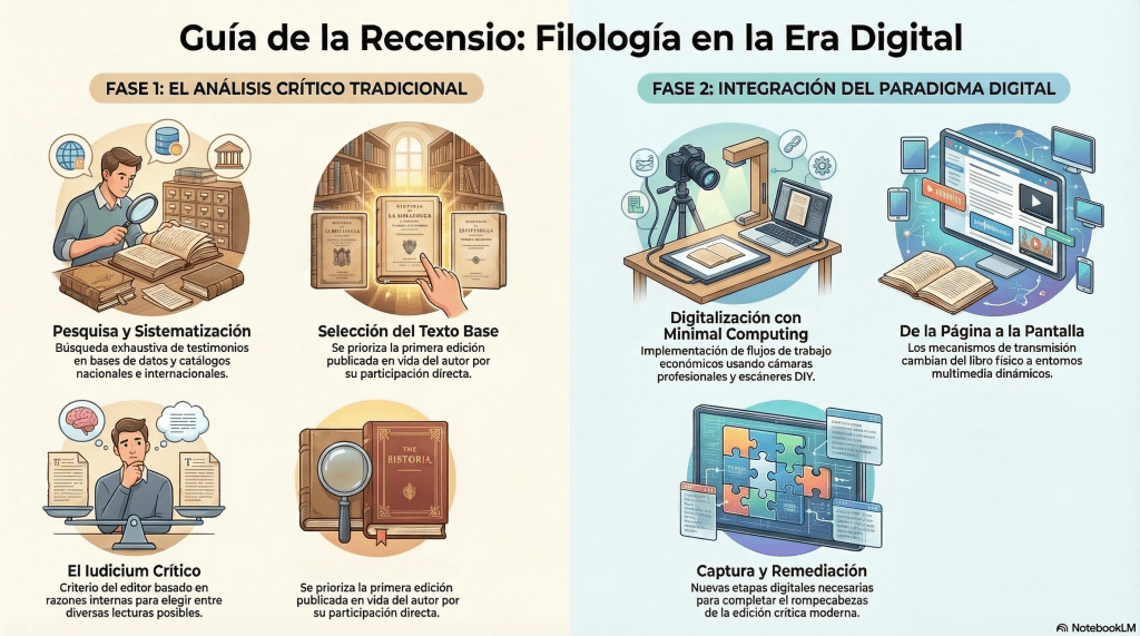 La recensio constituye la fase inicial y científica de la crítica textual, orientada a sistematizar los testimonios de una obra para establecer sus relaciones y variantes. En el marco de la Edición Crítica Digital (ECD), este proceso integra el paradigma de las Humanidades Digitales, utilizando flujos de trabajo como el minimal computing y el uso de escáneres DIY para la captura de imágenes. El objetivo final es la creación de un stemma (árbol genealógico) que refleje el arquetipo y las variaciones de la obra en su recorrido editorial, basándose en cinco etapas clave: la síntesis de historias de transmisión, la descripción bibliográfica, la elección del texto base (usualmente la primera edición en vida del autor), la captura y la remediación. Para depurar la información y seleccionar los testimonios más significativos, el filólogo aplica su iudicium (juicio crítico) y métodos como los loci critici —cotejo de pasajes conflictivos— para asegurar un establecimiento riguroso del texto que no altere la poética del autor.