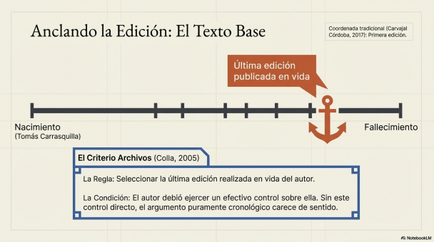 Realizado el levantamiento de los testimonios —es decir, la localización y reunión de las distintas versiones o ejemplares de la obra— y su posterior descripción, que implica registrar sus características materiales, editoriales y textuales, el siguiente paso consiste en determinar el texto base. Con frecuencia, esta elección recae en la primera edición publicada en vida del autor, pues suele reflejar de forma más cercana su intervención en la fijación del texto y se convierte así en el punto de partida para el trabajo ecdótico posterior.