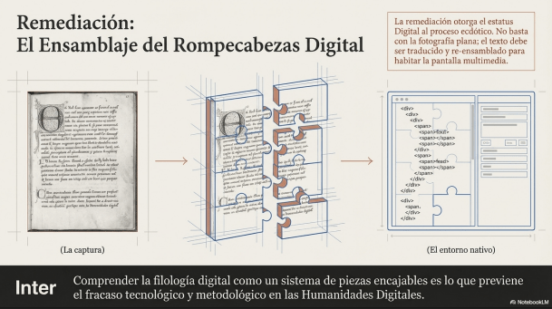 Ahora bien, a partir de los aportes del paradigma ecdótico digital, el proceso incorpora dos etapas adicionales fundamentales para la elaboración de la ECD de Frutos de mi tierra: la captura y la remediación. Estas fases permiten preparar y transformar el material original para su tratamiento en entornos digitales, ampliando así las posibilidades de análisis y edición del texto.