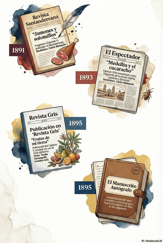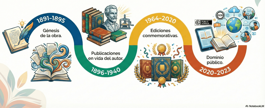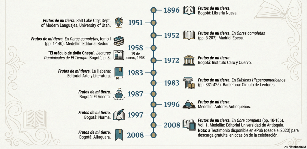 La reconstrucción de las historias de transmisión de Frutos de mi tierra permite seguir, paso a paso, los 133 años de vida textual de la obra: desde su gestación en espacios privados hasta su circulación en formatos digitales. El estudio distingue tres grandes “líneas de familia”. La primera es la pretextual o genética (1891–1895), donde entran el manuscrito autógrafo y las publicaciones parciales en prensa. La segunda es la textual o impresa (1896–2020), que inicia con la primera edición y se prolonga en cerca de 19 ediciones póstumas. La tercera es la digital (2016–2023), visible en soportes como PDF y ePub. A su vez, estas filiaciones se pueden sintetizar en función de las variantes de autor y de editor de la siguiente manera: