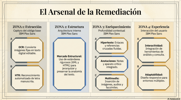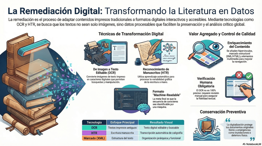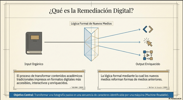 La remediación se define como el proceso de transformar y adaptar contenidos académicos tradicionales, como libros impresos, en formatos digitales más accesibles, interactivos y enriquecidos, permitiendo que la información sea identificable por una máquina. Su importancia radica en que aplica la lógica de los nuevos medios para reformar formas anteriores, convirtiendo imágenes capturadas en un formato legible por máquina (machine-readable form) a través de tecnologías como el OCR y el HTR.