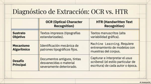 Ahora veremos brevemente la diferencia entre OCR y HTR, dos herramientas de reconocimiento de texto utilizadas en proyectos de edición y análisis digital de documentos. Mientras una se aplica a textos impresos, la otra permite trabajar con manuscritos, ampliando las posibilidades de transcripción y estudio en archivos digitales.