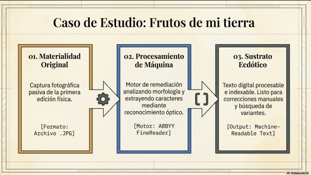 En la ECD de Frutos de mi tierra, la remediación hizo posible organizar y acondicionar todo el material antes de su tratamiento en las distintas etapas del proceso ecdótico. Entre estas tareas se encuentra la corrección del archivo generado mediante OCR, necesaria para ajustar y depurar el texto obtenido a partir de las imágenes.